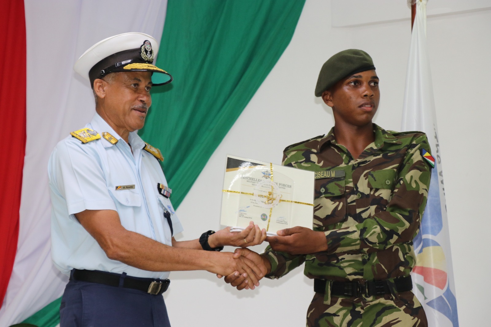 The ceremony was held this afternoon at the Military Training Support CentreAuditorium- Ile Perseverance, in the presence of Chairman of the Defence Comitee Honorable Clifford Andre,Chief of Defence Forces Brigadier Michael Rosette, senior SDF officers, and family members and friends of the new recruits.