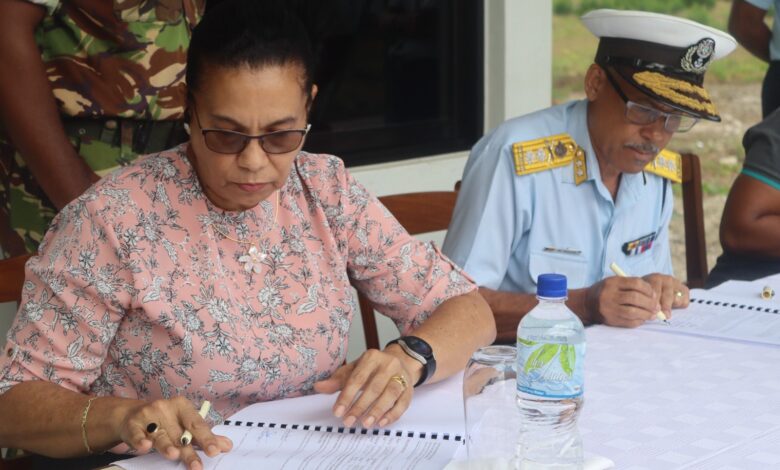 The Chief of Defence Forces Major General Micheal Rosette, Ms. Christine Henry Project Manager representing SIA and a representative from RONFORD Construction signed the official handing over document for the construction of a new guard room at MTSC.