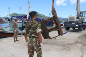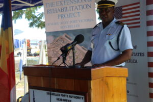 During a small ceremony this morning, senior officials including the Chief of Staff were briefed about the ongoing works and had the opportunity to observe the dive operations. LieutenantColonel David Arrisol, Acting Commander of Seychelles Coast Guards, thanked the United States of America government to assist the force with these professional navy divers for realization of this operation. He also thanked the port authority management for the good coordination and support provided and will continue to give until the completion of this project.
