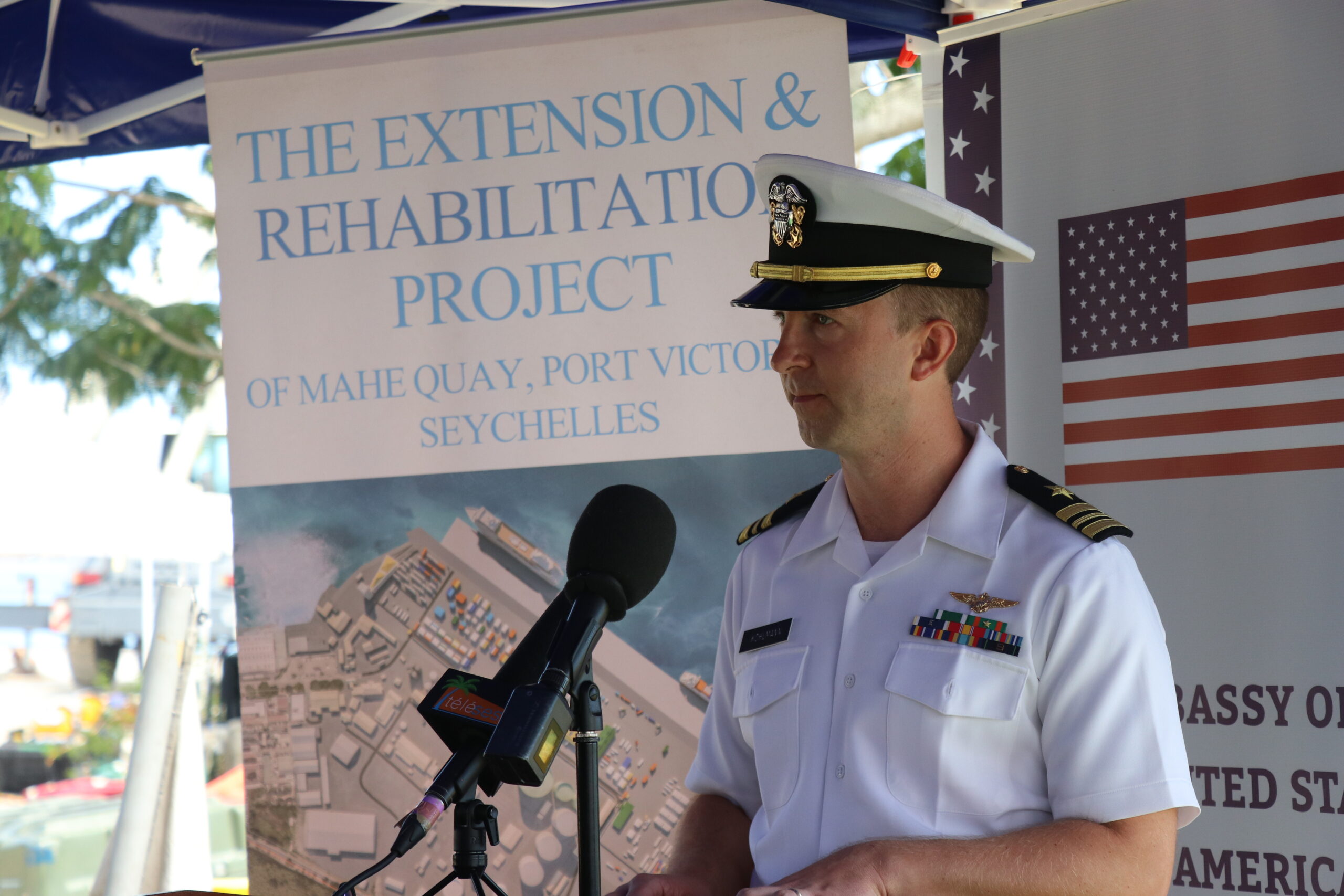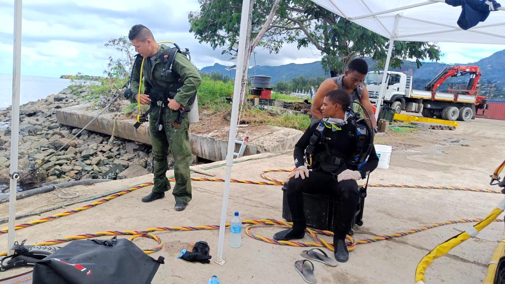 During a small ceremony this morning, senior officials including the Chief of Staff were briefed about the ongoing works and had the opportunity to observe the dive operations. LieutenantColonel David Arrisol, Acting Commander of Seychelles Coast Guards, thanked the United States of America government to assist the force with these professional navy divers for realization of this operation. He also thanked the port authority management for the good coordination and support provided and will continue to give until the completion of this project.