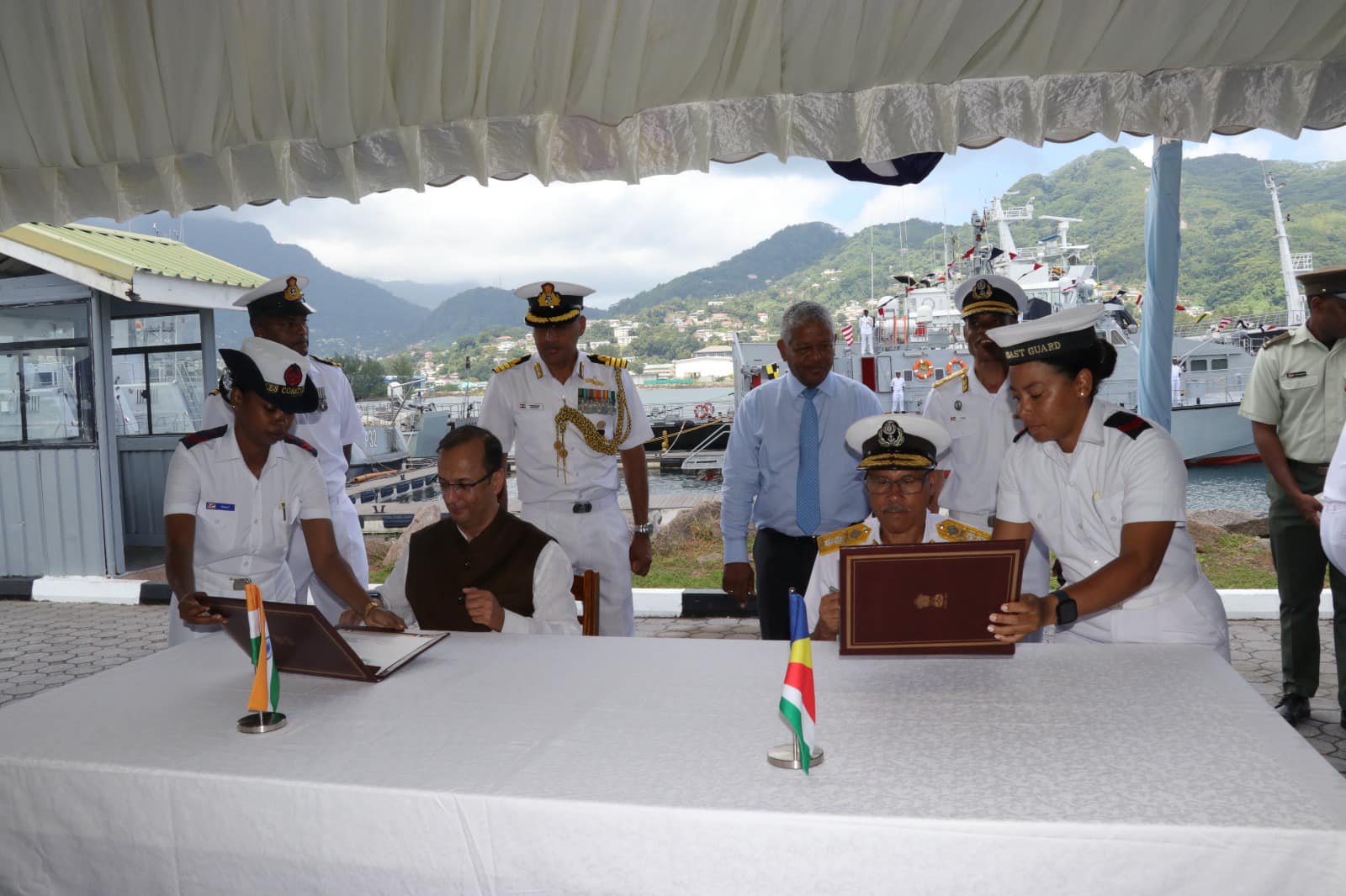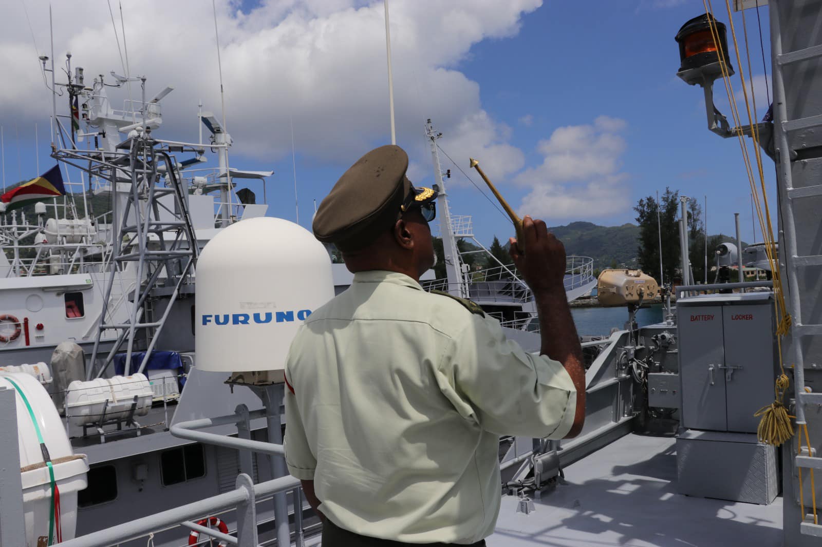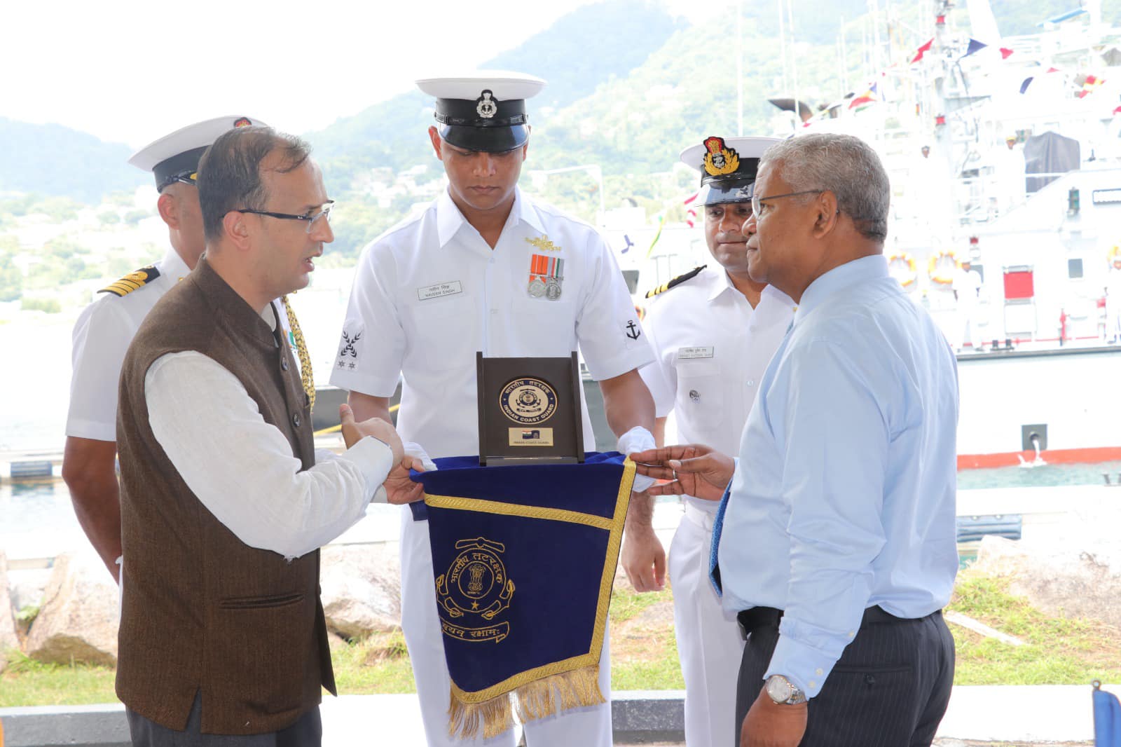 In a small ceremony this morning, the SDF Commisioned another vessel into its fleet. The ceremony was held at the Seychelles Coast Guards Base in the presence of the Commander In Chief President Wavel Ramkalawan, Vice President Mr. Ahmed Afif, Ambassador for India Mr. Kartik Pande, ministers, members of the Defence Force council and military personnel from both the SDF and Indian Armed Forces.
